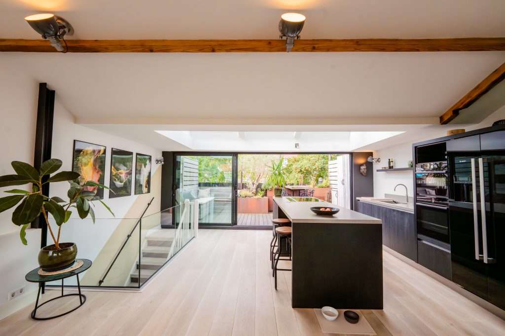 De bovenste verdieping is een ware eyecatcher: een lichte, open woonkamer die overloopt in een moderne keuken met een keukeneiland – perfect voor dynamische shots en culinaire scènes. Het dakterras biedt een prachtige achtergrond voor buitenopnames, van zonsopgang tot zonsondergang.